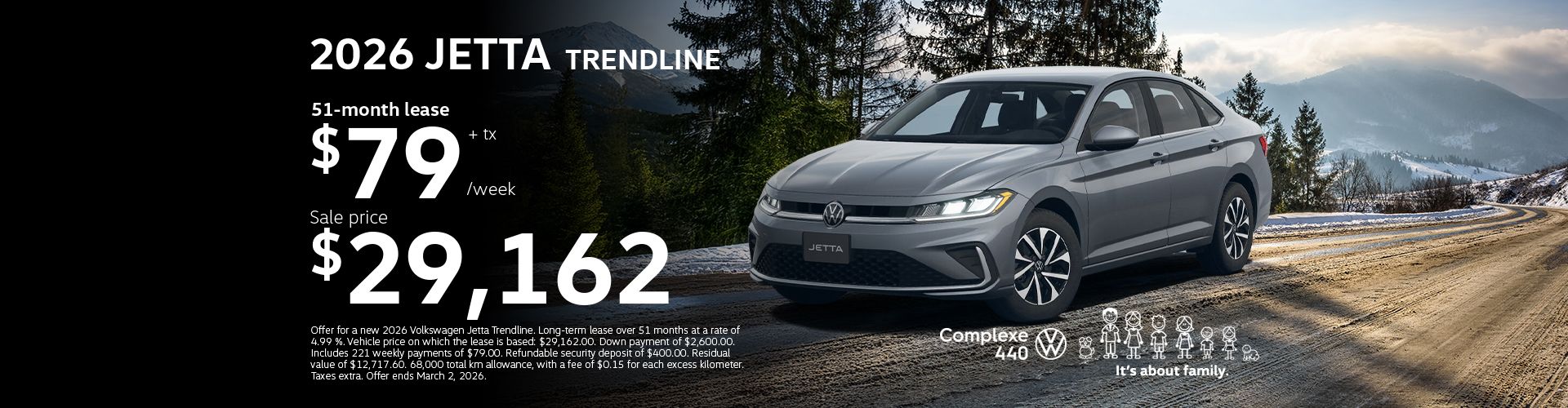 Cash purchase offer is based on the 2026 VOLKSWAGEN Jetta Trendline FWD (BU52RS ac0900560aa4) model, with 1.5L 4 cyl. engine and 8 speed Automatic transmission. Cash purchase selling price is $29,687.95 (plus taxes). Cash purchase selling price ($29,687.95) includes: Freight and PDI ($2,050.00), Admin fee ($499.00), Marquage Anti-vol VW (optional) ($399.95), Air conditioning excise tax ($100.00), Wheel locks (optional) ($96.00), PPSA Registration Fee (On Financing) ($48.00) including installation. Plus (GST/QST) & Licensing. Cash purchase selling price ($29,687.95) excludes: Tire Duty ($22.50). Finance offer is based on the 2026 VOLKSWAGEN Jetta Trendline FWD (BU52RS ac0900560aa4) model, with 1.5L 4 cyl. engine and 8 speed Automatic transmission. Finance selling price is $29,639.95 (plus taxes). Finance payments include: Freight and PDI ($2,050.00), Admin fee ($499.00), Marquage Anti-vol VW (optional) ($399.95), Air conditioning excise tax ($100.00), Wheel locks (optional) ($96.00), Publication Fee ($49.00), PPSA Service Fee ($13.22) including installation. Finance payments exclude: Tire Duty ($22.50). Finance offer is based on a 84 months term and 6.29% interest rate. 364 weekly payments of $100.90 ($116.01 taxes included) with $0.00 cash down and $0.00 net trade in. Cash down payments are due upon vehicle delivery. Trade-in tax credits require proof of ownership. Finance total obligation is $42,227.64 (taxes included). Finance total cost of credit is $8,086.88. Annual Percentage Rate (APR) is 6.3%. Limited time purchase financing offer on approved credit. Some customers will not qualify. Rates and requirements may vary depending on credit worthiness. Payments and conditions may vary for a commercial use. All applicable taxes are calculated on the total amount prior to deduction of the down payment. Lease offer is based on the 2026 VOLKSWAGEN Jetta Trendline FWD (BU52RS ac0900560aa4) model, with 1.5L 4 cyl. engine and 8 speed Automatic transmission. Lease selling price is $29,639.95 (plus taxes). Lease payments include: Freight and PDI ($2,050.00), Admin fee ($499.00), Marquage Anti-vol VW (optional) ($399.95), Air conditioning excise tax ($100.00), Wheel locks (optional) ($96.00) including installation. Lease payments exclude: Publication Fee ($49.00), Tire Duty ($22.50), PPSA Service Fee ($11.50). Lease offer is based on a 60 months term and 5.99% interest rate. 260 weekly payments of $93.40 ($107.39 taxes included) with $0.00 cash down and $0.00 net trade in. $0.00 down payment and tax on down payment, $0.00 net trade-in and $107.39 first payment are due at lease inception. Total amount due at lease inception is $625.48 ($0.00 down payment, Security deposit ($430.00), First payment ($107.39), Publication Fee ($49.00), Tire Duty ($22.50), PPSA Service Fee ($11.50) and (GST/QST) $5.09). Trade-in tax credits require proof of ownership. Lease offer is based on a 16000 kilometer allowance per year. $0.15 fee per excess kilometer will apply. Estimated vehicle residual value is $11,657.80. An option to purchase at lease end (Buy Back Value) of $12,157.80 may be available. A security deposit might be required. Limited time leasing offer on approved credit. Some customers will not qualify. Rates and requirements may vary depending on credit worthiness. Payments and conditions may vary for a commercial use. Taxes on initial cash down and after tax rebates (including government rebate) are excluded and must be paid upon delivery. Lease total obligation is $28,439.49 (taxes included). Lease total cost of credit is $6,801.85. Annual Percentage Rate (APR) is 6.54%. The illustrated vehicle is based on the 2026 VOLKSWAGEN Jetta Highline FWD (BU54RS bf3351c8f450) model, with 1.5L 4 cyl. engine and 8 speed Automatic transmission. The illustrated vehicle's cash purchase selling price is $35,787.95. Levy and other environmental or related levies, other taxes (including, where applicable, GST and PST or HST), additional options, license, insurance and registration are extra. While every reasonable effort is made to ensure the accuracy of this information, we are not responsible for any errors or omissions contained on these pages. Please verify all information and pricing with a sales representative or ask online. The dealership reserves the right to make changes at any time, without notice, to the prices, rates, models, materials, equipment, specifications, and availability, or to discontinue models or equipment. Vehicle trade-ins are subject to dealer's approval. Trade-in tax credits require proof of ownership.