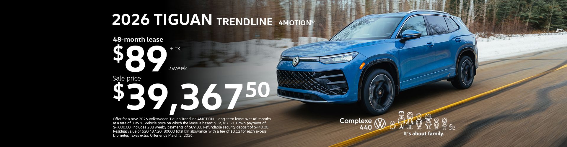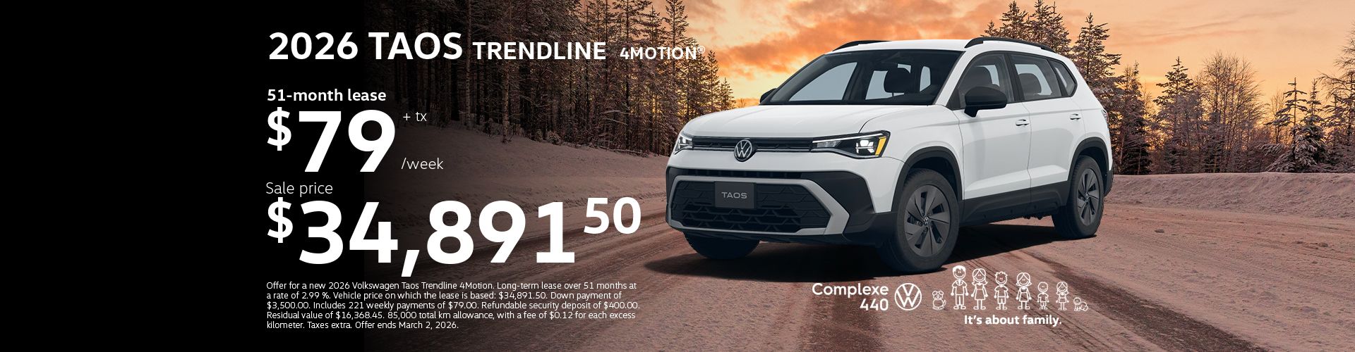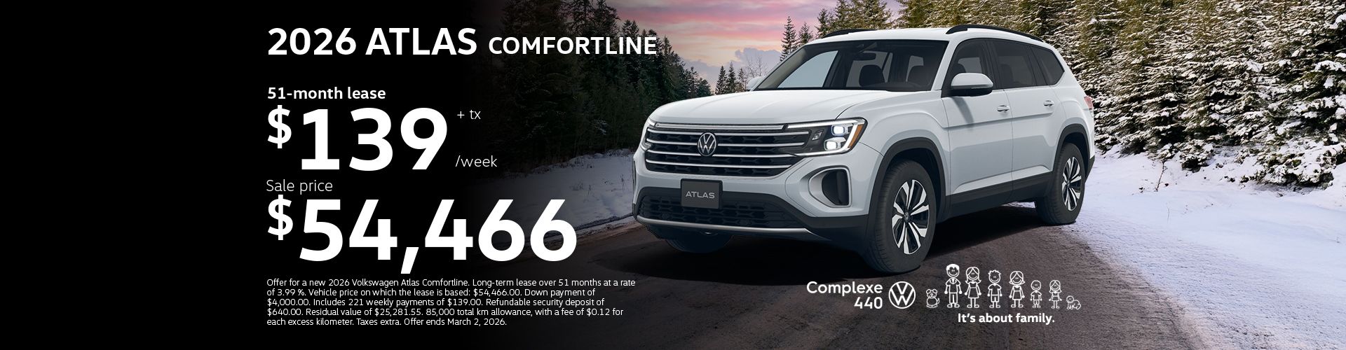 Cash purchase offer is based on the 2026 VOLKSWAGEN Atlas Comfortline AWD (CA33PR d223753989d0) model, with 2L 4 cyl. engine and 8 speed Automatic transmission. Cash purchase selling price is $54,987.95 (plus taxes). Cash purchase selling price ($54,987.95) includes: Freight and PDI ($2,250.00), Admin fee ($499.00), Marquage Anti-vol VW (optional) ($399.95), Air conditioning excise tax ($100.00), Wheel locks (optional) ($96.00), PPSA Registration Fee (On Financing) ($48.00) including installation. Plus (GST/QST) & Licensing. Cash purchase selling price ($54,987.95) excludes: Tire Duty ($22.50). Finance offer is based on the 2026 VOLKSWAGEN Atlas Comfortline AWD (CA33PR d223753989d0) model, with 2L 4 cyl. engine and 8 speed Automatic transmission. Finance selling price is $54,939.95 (plus taxes). Finance payments include: Freight and PDI ($2,250.00), Admin fee ($499.00), Marquage Anti-vol VW (optional) ($399.95), Air conditioning excise tax ($100.00), Wheel locks (optional) ($96.00), Publication Fee ($49.00), PPSA Service Fee ($13.22) including installation. Finance payments exclude: Tire Duty ($22.50). Finance offer is based on a 84 months term and 4.49% interest rate. 364 weekly payments of $176.13 ($202.51 taxes included) with $0.00 cash down and $0.00 net trade in. Cash down payments are due upon vehicle delivery. Trade-in tax credits require proof of ownership. Finance total obligation is $73,713.64 (taxes included). Finance total cost of credit is $10,484.21. Annual Percentage Rate (APR) is 4.5%. Limited time purchase financing offer on approved credit. Some customers will not qualify. Rates and requirements may vary depending on credit worthiness. Payments and conditions may vary for a commercial use. All applicable taxes are calculated on the total amount prior to deduction of the down payment. Lease offer is based on the 2026 VOLKSWAGEN Atlas Comfortline AWD (CA33PR d223753989d0) model, with 2L 4 cyl. engine and 8 speed Automatic transmission. Lease selling price is $54,939.95 (plus taxes). Lease payments include: Freight and PDI ($2,250.00), Admin fee ($499.00), Marquage Anti-vol VW (optional) ($399.95), Air conditioning excise tax ($100.00), Wheel locks (optional) ($96.00) including installation. Lease payments exclude: Publication Fee ($49.00), Tire Duty ($22.50), PPSA Service Fee ($11.50). Lease offer is based on a 51 months term and 3.99% interest rate. 221 weekly payments of $158.80 ($182.58 taxes included) with $0.00 cash down and $0.00 net trade in. $0.00 down payment and tax on down payment, $0.00 net trade-in and $182.58 first payment are due at lease inception. Total amount due at lease inception is $1,010.67 ($0.00 down payment, Security deposit ($740.00), First payment ($182.58), Publication Fee ($49.00), Tire Duty ($22.50), PPSA Service Fee ($11.50) and (GST/QST) $5.09). Trade-in tax credits require proof of ownership. Lease offer is based on a 16000 kilometer allowance per year. $0.15 fee per excess kilometer will apply. Estimated vehicle residual value is $26,829.40. An option to purchase at lease end (Buy Back Value) of $27,329.40 may be available. A security deposit might be required. Limited time leasing offer on approved credit. Some customers will not qualify. Rates and requirements may vary depending on credit worthiness. Payments and conditions may vary for a commercial use. Taxes on initial cash down and after tax rebates (including government rebate) are excluded and must be paid upon delivery. Lease total obligation is $41,178.27 (taxes included). Lease total cost of credit is $7,484.25. Annual Percentage Rate (APR) is 4.3%. The illustrated vehicle is based on the 2026 VOLKSWAGEN Atlas Execline AWD (CA35PR 20da34ec60fd) model, with 2L 4 cyl. engine and 8 speed Automatic transmission. The illustrated vehicle's cash purchase selling price is $64,987.95. Levy and other environmental or related levies, other taxes (including, where applicable, GST and PST or HST), additional options, license, insurance and registration are extra. While every reasonable effort is made to ensure the accuracy of this information, we are not responsible for any errors or omissions contained on these pages. Please verify all information and pricing with a sales representative or ask online. The dealership reserves the right to make changes at any time, without notice, to the prices, rates, models, materials, equipment, specifications, and availability, or to discontinue models or equipment. Vehicle trade-ins are subject to dealer's approval. Trade-in tax credits require proof of ownership.