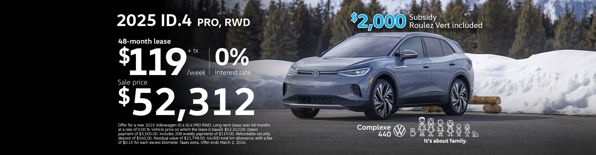 Complexe VW 440 and Volkswagen Canada offer you financing solutions for the purchase or leasing of a new or used Volkswagen vehicle. Visit our Complexe Volkswagen 440 dealership in Laval and take advantage of current Volkswagen offers and VW Atlas Cross Sport and VW Tiguan), cars (VW Golf, Jetta, Golf GTI, Jetta GLI and Passat) as well as electric vehicles like the VW iD.4. Visit our showroom and speak with one of our Volkswagen expert advisers.