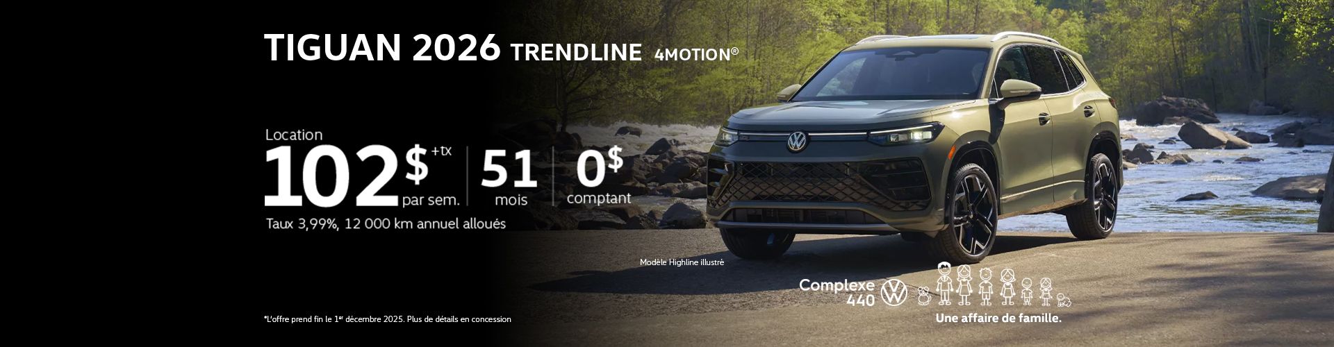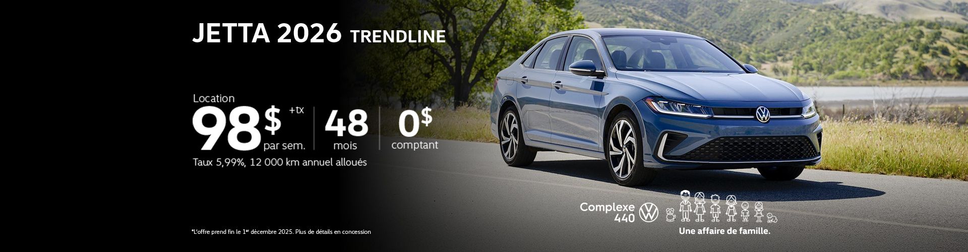 L'offre d'achat au comptant est basée sur le modèle 2026 VOLKSWAGEN Jetta Trendline TAV (BU52RS ac0900560aa4), avec moteur 1,5L 4 cyl. et transmission Automatique 8 vitesses. Le prix de vente à l'achat au comptant est de 29 687,95 $ (plus taxes). Le prix de vente (29 687,95 $) à l'achat au comptant inclut: Transport et Préparation (2 050,00 $), Frais d'administration (499,00 $), Marquage antivol vw (optionnel) (399,95 $), Taxe d'accise sur le climatiseur (100,00 $), Barrures de roues (optionnel) (96,00 $), Frais Inscription RDPRM (Applicable en Financement) (48,00 $) installation comprise. Plus (TPS/TVQ) et immatriculation. Le prix de vente (29 687,95 $) à l'achat au comptant exclus: Taxe sur les pneus (22,50 $). L'offre de financement est basée sur le modèle 2026 VOLKSWAGEN Jetta Trendline TAV (BU52RS ac0900560aa4), avec moteur 1,5L 4 cyl. et transmission Automatique 8 vitesses. Le prix de vente en financement est de 29 639,95 $ (taxes en sus). Les paiements en financement incluent: Transport et Préparation (2 050,00 $), Frais d'administration (499,00 $), Marquage antivol vw (optionnel) (399,95 $), Taxe d'accise sur le climatiseur (100,00 $), Barrures de roues (optionnel) (96,00 $), Frais de publication (48,00 $), Frais Service RDPRM (13,22 $) installation comprise. Les paiements en financement excluent: Taxe sur les pneus (22,50 $). L'offre de financement est basée sur un terme de 84 mois avec un taux d'intérêt de 6,69%. Les 364 paiements à la semaine de 102,21 $ (117,52 $ taxes incluses) incluent un acompte de 0,00 $ et un échange net de 0,00 $. Les acomptes sont dus à la livraison du véhicule. Les crédits de taxes pour l'échange sont soumis à une preuve de propriété. L’obligation totale en financement est de 42 777,28 $ (taxes comprises). Les frais de crédit totaux en financement sont de 8 637,52 $. Le taux annuel en pourcentage (TAP) est de 6,7%. Offre de financement d'une periode limitée sur approbation de crédit. Les taux et les exigences peuvent varier en fonction de la solvabilité. Les paiements et conditions peuvent différer pour une utilisation commerciale. Certains client ne pourront se qualifier. Les taxes applicables sont calculées sur le montant total avant déduction de l'acompte. L'offre de location est basée sur le modèle 2026 VOLKSWAGEN Jetta Trendline TAV (BU52RS ac0900560aa4), avec moteur 1,5L 4 cyl. et transmission Automatique 8 vitesses. Le prix de vente en location est de 29 639,95 $ (taxes en sus). Les paiements en location incluent: Transport et Préparation (2 050,00 $), Frais d'administration (499,00 $), Marquage antivol vw (optionnel) (399,95 $), Taxe d'accise sur le climatiseur (100,00 $), Barrures de roues (optionnel) (96,00 $) installation comprise. Les paiements en location excluent: Frais de publication (48,00 $), Taxe sur les pneus (22,50 $), Frais Service RDPRM (11,50 $). L'offre de location est basée sur un terme de 60 mois avec un taux d'intérêt de 6,99%. Les 260 paiements à la semaine de 96,69 $ (111,16 $ taxes incluses) incluent un acompte de 0,00 $ et un échange net de 0,00 $. Les acomptes sont dus à la livraison du véhicule. L'acompte de 0,00 $ et la taxe sur l'acompte, l'échange net de 0,00 $ et le premier paiement de 111,16 $ sont dûs au début du bail. Le montant total dû au début du bail est 648,25 $ (Acompte de 0,00 $, Dépôt de sécurité (450,00 $), Premier paiement (111,16 $), Frais de publication (48,00 $), Taxe sur les pneus (22,50 $), Frais Service RDPRM (11,50 $) et (TPS/TVQ) 5,09 $). Les crédits de taxes pour l'échange sont soumis à une preuve de propriété. L'offre de location est basé sur un plan de kilométrage de 16000 km par année. Des frais de 0,15 $ par kilomètre supplémentaire seront applicables. La valeur résiduelle estimée est de 11 922,75 $. Une option d'achat à la fin de la location pourrait être disponible (Valeur de Rachat) au montant de 12 422,75 $. Un dépôt de sécurité pourrait être requis. Offre de location d'une periode limitée sur approbation de crédit. Les taux et les exigences peuvent varier en fonction de la solvabilité. Les paiements et conditions peuvent différer pour une utilisation commerciale. Certains client ne pourront se qualifier. Les taxes sur le comptant initial et les rabais après taxes (incluant les rabais du gouvernement) sont exclues et doivent être payées à la livraison. L’obligation totale en location est de 29 438,69 $ (taxes comprises). Les frais de crédit totaux en location sont de 7 922,20 $. Le taux annuel en pourcentage (TAP) est de 7,54%. Le véhicule illustré est basé sur le modèle 2026 VOLKSWAGEN Jetta Highline TAV (BU54RS bf3351c8f450), avec moteur 1,5L 4 cyl. et transmission Automatique 8 vitesses. Le prix de vente à l'achat au comptant du véhicule illustré est de 35 787,95 $. Droits et autres frais environnementaux, immatriculation, assurance, enregistrement, options additionnelles et taxes applicables sont en sus. Bien que tous les efforts raisonnables soient faits pour assurer l'exactitude de ces informations, nous ne sommes pas responsables des erreurs ou omissions contenues sur ces pages. S'il vous plaît vérifier toutes les informations et les prix avec un représentant des ventes ou demander en ligne. Le concessionnaire se réserve le droit de faire des modifications aux prix, aux taux, aux modèles, aux matériaux, aux équipements, aux caractéristiques et aux disponibilités ou d'interrompre la production de tout modèle ou tout équipement, à tout moment et sans préavis. Les véhicules d'échange dépendent de l'approbation du concessionnaire. Les crédits de taxes pour l'échange sont soumis à une preuve de propriété.