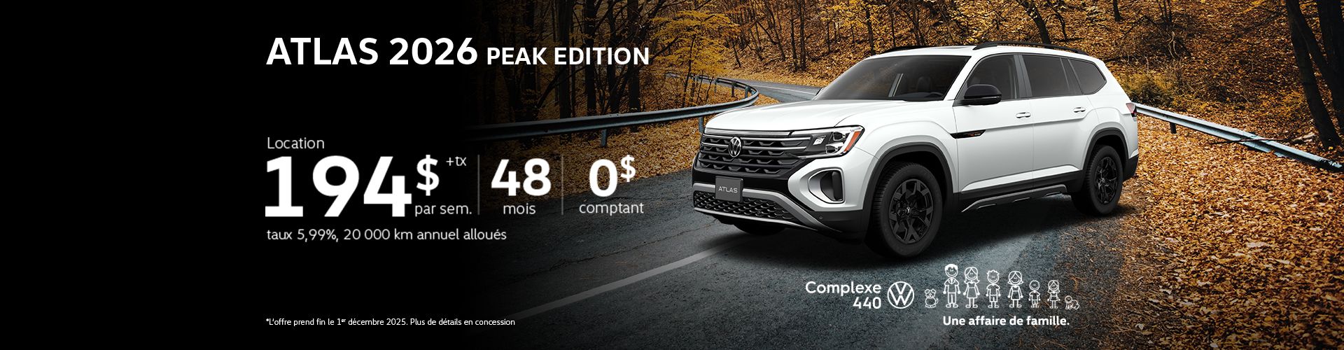 L'offre d'achat au comptant est basée sur le modèle 2025 VOLKSWAGEN Atlas Comfortline TI (CA33PR 23226ac71e5d), avec moteur 2L 4 cyl. et transmission Automatique 8 vitesses. Le prix de vente à l'achat au comptant est de 54 987,95 $ (plus taxes). Le prix de vente (54 987,95 $) à l'achat au comptant inclut: Transport et Préparation (2 250,00 $), Frais d'administration (499,00 $), Marquage antivol vw (optionnel) (399,95 $), Taxe d'accise sur le climatiseur (100,00 $), Barrures de roues (optionnel) (96,00 $), Frais Inscription RDPRM (Applicable en Financement) (48,00 $) installation comprise. Plus (TPS/TVQ) et immatriculation. Le prix de vente (54 987,95 $) à l'achat au comptant exclus: Taxe sur les pneus (22,50 $). L'offre de financement est basée sur le modèle 2025 VOLKSWAGEN Atlas Comfortline TI (CA33PR 23226ac71e5d), avec moteur 2L 4 cyl. et transmission Automatique 8 vitesses. Le prix de vente en financement est de 54 939,95 $ (taxes en sus). Les paiements en financement incluent: Transport et Préparation (2 250,00 $), Frais d'administration (499,00 $), Marquage antivol vw (optionnel) (399,95 $), Taxe d'accise sur le climatiseur (100,00 $), Barrures de roues (optionnel) (96,00 $), Frais de publication (48,00 $), Frais Service RDPRM (13,22 $) installation comprise. Les paiements en financement excluent: Taxe sur les pneus (22,50 $). L'offre de financement est basée sur un terme de 84 mois avec un taux d'intérêt de 4,99%. Les 364 paiements à la semaine de 179,07 $ (205,89 $ taxes incluses) incluent un acompte de 0,00 $ et un échange net de 0,00 $. Les acomptes sont dus à la livraison du véhicule. Les crédits de taxes pour l'échange sont soumis à une preuve de propriété. L’obligation totale en financement est de 74 943,96 $ (taxes comprises). Les frais de crédit totaux en financement sont de 11 715,53 $. Le taux annuel en pourcentage (TAP) est de 5%. Offre de financement d'une periode limitée sur approbation de crédit. Les taux et les exigences peuvent varier en fonction de la solvabilité. Les paiements et conditions peuvent différer pour une utilisation commerciale. Certains client ne pourront se qualifier. Les taxes applicables sont calculées sur le montant total avant déduction de l'acompte. L'offre de location est basée sur le modèle 2025 VOLKSWAGEN Atlas Comfortline TI (CA33PR 23226ac71e5d), avec moteur 2L 4 cyl. et transmission Automatique 8 vitesses. Le prix de vente en location est de 54 939,95 $ (taxes en sus). Les paiements en location incluent: Transport et Préparation (2 250,00 $), Frais d'administration (499,00 $), Marquage antivol vw (optionnel) (399,95 $), Taxe d'accise sur le climatiseur (100,00 $), Barrures de roues (optionnel) (96,00 $) installation comprise. Les paiements en location excluent: Frais de publication (48,00 $), Taxe sur les pneus (22,50 $), Frais Service RDPRM (11,50 $). L'offre de location est basée sur un terme de 60 mois avec un taux d'intérêt de 7,99%. Les 260 paiements à la semaine de 191,55 $ (220,24 $ taxes incluses) incluent un acompte de 0,00 $ et un échange net de 0,00 $. Les acomptes sont dus à la livraison du véhicule. L'acompte de 0,00 $ et la taxe sur l'acompte, l'échange net de 0,00 $ et le premier paiement de 220,24 $ sont dûs au début du bail. Le montant total dû au début du bail est 1 197,33 $ (Acompte de 0,00 $, Dépôt de sécurité (890,00 $), Premier paiement (220,24 $), Frais de publication (48,00 $), Taxe sur les pneus (22,50 $), Frais Service RDPRM (11,50 $) et (TPS/TVQ) 5,09 $). Les crédits de taxes pour l'échange sont soumis à une preuve de propriété. L'offre de location est basé sur un plan de kilométrage de 16000 km par année. Des frais de 0,15 $ par kilomètre supplémentaire seront applicables. La valeur résiduelle estimée est de 20 638,00 $. Une option d'achat à la fin de la location pourrait être disponible (Valeur de Rachat) au montant de 21 138,00 $. Un dépôt de sécurité pourrait être requis. Offre de location d'une periode limitée sur approbation de crédit. Les taux et les exigences peuvent varier en fonction de la solvabilité. Les paiements et conditions peuvent différer pour une utilisation commerciale. Certains client ne pourront se qualifier. Les taxes sur le comptant initial et les rabais après taxes (incluant les rabais du gouvernement) sont exclues et doivent être payées à la livraison. L’obligation totale en location est de 58 239,49 $ (taxes comprises). Les frais de crédit totaux en location sont de 16 001,05 $. Le taux annuel en pourcentage (TAP) est de 8,3%. Le véhicule illustré est basé sur le modèle 2025 VOLKSWAGEN Atlas Execline TI (CA35PR 70c39e70dd1c), avec moteur 2L 4 cyl. et transmission Automatique 8 vitesses. Le prix de vente à l'achat au comptant du véhicule illustré est de 64 987,95 $. Droits et autres frais environnementaux, immatriculation, assurance, enregistrement, options additionnelles et taxes applicables sont en sus. Bien que tous les efforts raisonnables soient faits pour assurer l'exactitude de ces informations, nous ne sommes pas responsables des erreurs ou omissions contenues sur ces pages. S'il vous plaît vérifier toutes les informations et les prix avec un représentant des ventes ou demander en ligne. Le concessionnaire se réserve le droit de faire des modifications aux prix, aux taux, aux modèles, aux matériaux, aux équipements, aux caractéristiques et aux disponibilités ou d'interrompre la production de tout modèle ou tout équipement, à tout moment et sans préavis. Les véhicules d'échange dépendent de l'approbation du concessionnaire. Les crédits de taxes pour l'échange sont soumis à une preuve de propriété.
