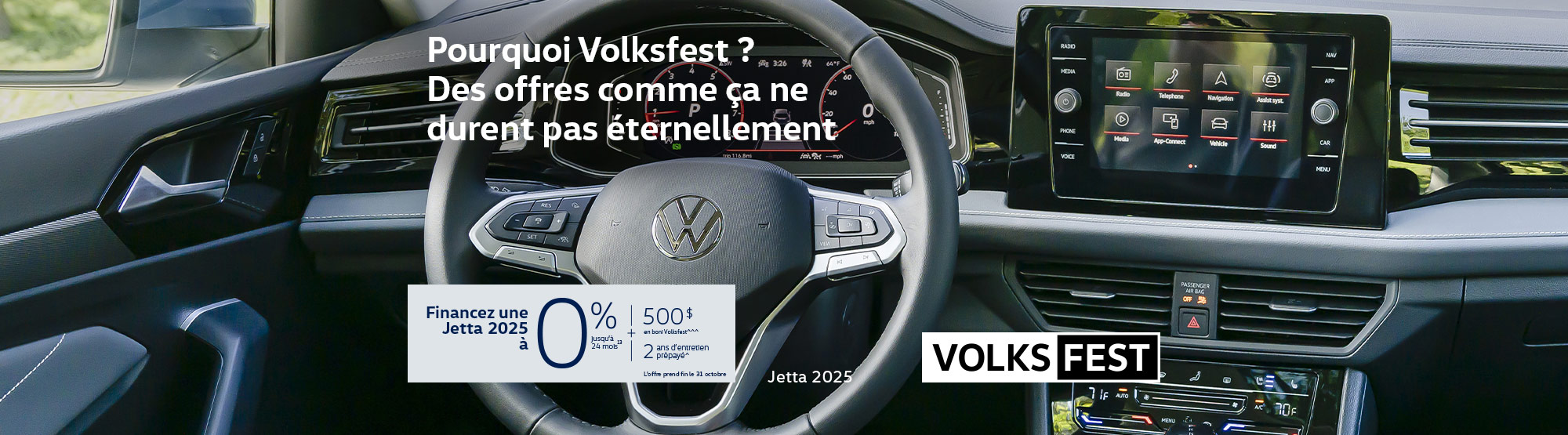 L'offre d'achat au comptant est basée sur le modèle 2026 VOLKSWAGEN JETTA Trendline TAV (BU52RS ac0900560aa4), avec moteur 1,5L 4 cyl. et transmission Automatique 8 vitesses. Le prix de vente à l'achat au comptant est de 29 687,95 $ (plus taxes). Le prix de vente (29 687,95 $) à l'achat au comptant inclut: Transport et Préparation (2 050,00 $), Frais d'administration (499,00 $), Marquage antivol vw (optionnel) (399,95 $), Taxe d'accise sur le climatiseur (100,00 $), Barrures de roues (optionnel) (96,00 $), Frais Inscription RDPRM (Applicable en Financement) (48,00 $) installation comprise. Plus (TPS/TVQ) et immatriculation. Le prix de vente (29 687,95 $) à l'achat au comptant exclus: Taxe sur les pneus (22,50 $). L'offre de financement est basée sur le modèle 2026 VOLKSWAGEN JETTA Trendline TAV (BU52RS ac0900560aa4), avec moteur 1,5L 4 cyl. et transmission Automatique 8 vitesses. Le prix de vente en financement est de 29 639,95 $ (taxes en sus). Les paiements en financement incluent: Transport et Préparation (2 050,00 $), Frais d'administration (499,00 $), Marquage antivol vw (optionnel) (399,95 $), Taxe d'accise sur le climatiseur (100,00 $), Barrures de roues (optionnel) (96,00 $), Frais de publication (48,00 $), Frais Service RDPRM (13,22 $) installation comprise. Les paiements en financement excluent: Taxe sur les pneus (22,50 $). L'offre de financement est basée sur un terme de 84 mois avec un taux d'intérêt de 6,69%. Les 364 paiements à la semaine de 102,21 $ (117,52 $ taxes incluses) incluent un acompte de 0,00 $ et un échange net de 0,00 $. Les acomptes sont dus à la livraison du véhicule. Les crédits de taxes pour l'échange sont soumis à une preuve de propriété. L’obligation totale en financement est de 42 777,28 $ (taxes comprises). Les frais de crédit totaux en financement sont de 8 637,52 $. Le taux annuel en pourcentage (TAP) est de 6,7%. Offre de financement d'une periode limitée sur approbation de crédit. Les taux et les exigences peuvent varier en fonction de la solvabilité. Les paiements et conditions peuvent différer pour une utilisation commerciale. Certains client ne pourront se qualifier. Les taxes applicables sont calculées sur le montant total avant déduction de l'acompte. L'offre de location est basée sur le modèle 2026 VOLKSWAGEN JETTA Trendline TAV (BU52RS ac0900560aa4), avec moteur 1,5L 4 cyl. et transmission Automatique 8 vitesses. Le prix de vente en location est de 29 639,95 $ (taxes en sus). Les paiements en location incluent: Transport et Préparation (2 050,00 $), Frais d'administration (499,00 $), Marquage antivol vw (optionnel) (399,95 $), Taxe d'accise sur le climatiseur (100,00 $), Barrures de roues (optionnel) (96,00 $) installation comprise. Les paiements en location excluent: Frais de publication (48,00 $), Taxe sur les pneus (22,50 $), Frais Service RDPRM (11,50 $). L'offre de location est basée sur un terme de 60 mois avec un taux d'intérêt de 6,99%. Les 260 paiements à la semaine de 95,83 $ (110,18 $ taxes incluses) incluent un acompte de 0,00 $ et un échange net de 0,00 $. Les acomptes sont dus à la livraison du véhicule. L'acompte de 0,00 $ et la taxe sur l'acompte, l'échange net de 0,00 $ et le premier paiement de 110,18 $ sont dûs au début du bail. Le montant total dû au début du bail est 647,27 $ (Acompte de 0,00 $, Dépôt de sécurité (450,00 $), Premier paiement (110,18 $), Frais de publication (48,00 $), Taxe sur les pneus (22,50 $), Frais Service RDPRM (11,50 $) et (TPS/TVQ) 5,09 $). Les crédits de taxes pour l'échange sont soumis à une preuve de propriété. L'offre de location est basé sur un plan de kilométrage de 16000 km par année. Des frais de 0,15 $ par kilomètre supplémentaire seront applicables. La valeur résiduelle estimée est de 12 187,70 $. Une option d'achat à la fin de la location pourrait être disponible (Valeur de Rachat) au montant de 12 687,70 $. Un dépôt de sécurité pourrait être requis. Offre de location d'une periode limitée sur approbation de crédit. Les taux et les exigences peuvent varier en fonction de la solvabilité. Les paiements et conditions peuvent différer pour une utilisation commerciale. Certains client ne pourront se qualifier. Les taxes sur le comptant initial et les rabais après taxes (incluant les rabais du gouvernement) sont exclues et doivent être payées à la livraison. L’obligation totale en location est de 29 183,89 $ (taxes comprises). Les frais de crédit totaux en location sont de 7 963,55 $. Le taux annuel en pourcentage (TAP) est de 7,54%. Le véhicule illustré est basé sur le modèle 2026 VOLKSWAGEN JETTA Highline TAV (BU54RS bf3351c8f450), avec moteur 1,5L 4 cyl. et transmission Automatique 8 vitesses. Le prix de vente à l'achat au comptant du véhicule illustré est de 35 787,95 $. Droits et autres frais environnementaux, immatriculation, assurance, enregistrement, options additionnelles et taxes applicables sont en sus. Bien que tous les efforts raisonnables soient faits pour assurer l'exactitude de ces informations, nous ne sommes pas responsables des erreurs ou omissions contenues sur ces pages. S'il vous plaît vérifier toutes les informations et les prix avec un représentant des ventes ou demander en ligne. Le concessionnaire se réserve le droit de faire des modifications aux prix, aux taux, aux modèles, aux matériaux, aux équipements, aux caractéristiques et aux disponibilités ou d'interrompre la production de tout modèle ou tout équipement, à tout moment et sans préavis. Les véhicules d'échange dépendent de l'approbation du concessionnaire. Les crédits de taxes pour l'échange sont soumis à une preuve de propriété.